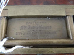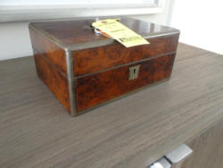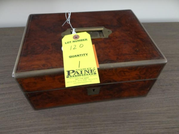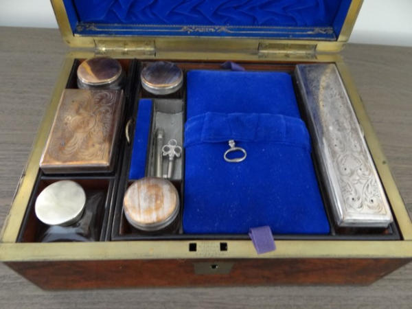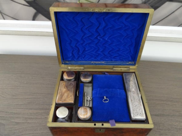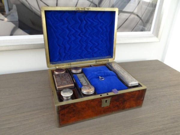 Item # 120 -- Antique burlwood toilet case with sterling silver cyrstal jars, 6"x 12"x 9", Retail $4750.00