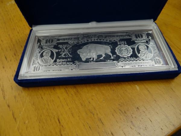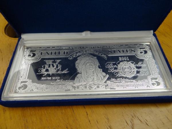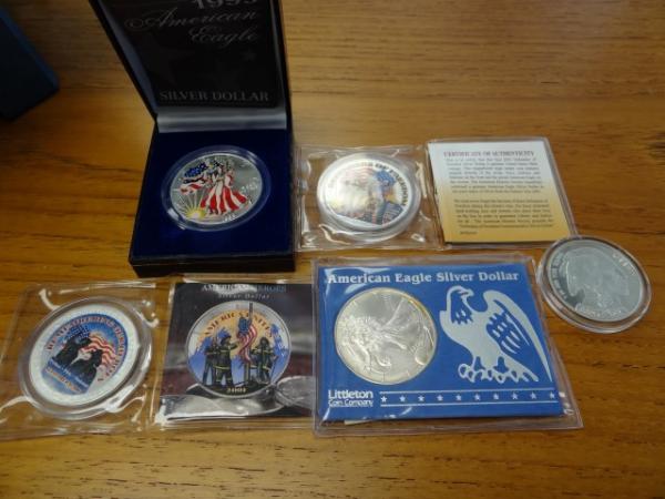 Silver: (2) one ounce bars, (1) one ounce round, (4) $1.00 Eagles, three are colorized