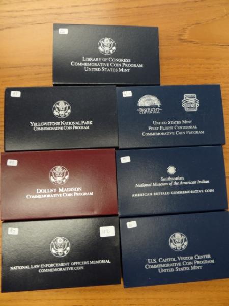 Modern Commemorative $1.00, Proof 1997 Law Enforcement, 1999 Dolley Madison & Yellowstone, 2000 Library of Congress, 2001 Buffalo & Capitol Visitors Center & 2003 First Flight (7 pieces)
