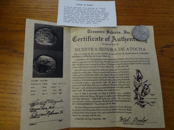 Item # 104 -- Shipwreck Coins with paperwork including an Atocha 8 Reales Cob