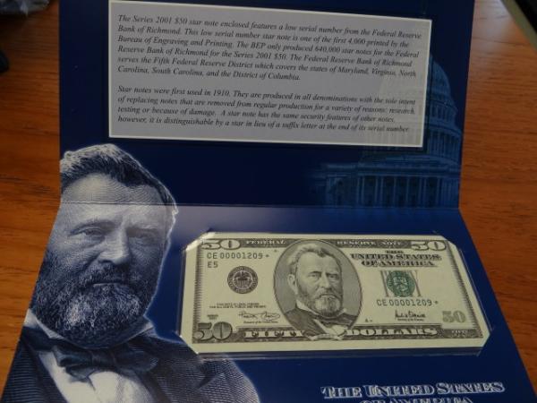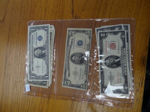 U.S. Small Size Notes: Silver Certificates: 1934 $1.00, EF & (16) later dates, (1) $5.00, Circulated Legal Tender: (3) $2.00, Circulated Federal Reserve Notes: 1969 $1.00, reverse ink smear, Circulated 1976 $2.00 First Day of Issue & 2001 Richmond $50.00 Star, low serial number 1209, Uncirculated in BEP folder