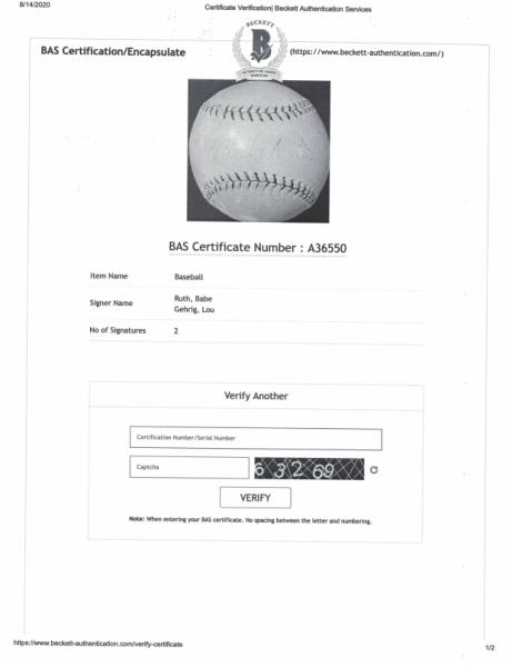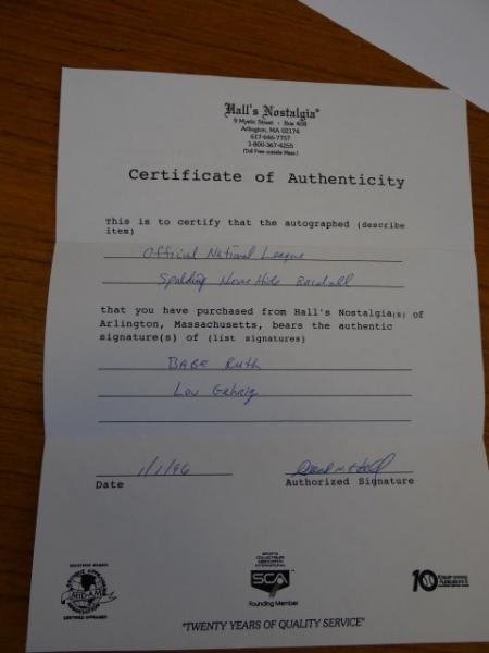 Item # 253 -- Babe Ruth / Lou Gehrig Signed Autographed MLB Baseball. Certificate of Authenticity Hall's Nostalgia. Also Authenticated by Beckett Authentication Services August 2020