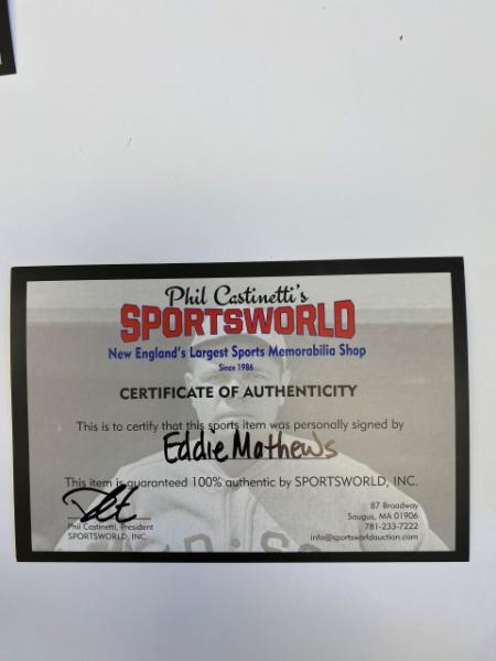 Item # 258 -- Eddie Mathews Signed Photo. Frame 9 1/2" x 11 1/2". Picture 8" x 10". Certificate of Authenticity Phil Castinetti's Sportsworld