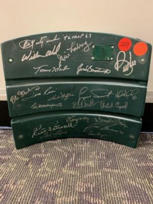 Item # 269 -- Autographed Boston Red Sox Seat Back. Old 17" x 15" Fenway Park Seat is Signed by Carl Yastrzemski, Louie Tiant, Jim Rice, Jose Canseco, Bill Lee etc. Certificate of Authenticity Phil Castinetti's Sportsworld