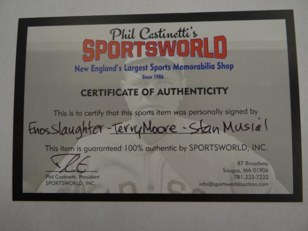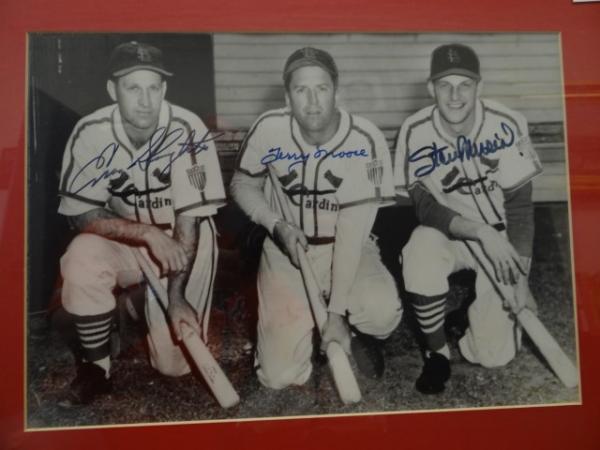 Framed Enos Slaughter, Terry Moore and Stan Musial Autographed Photo. 9 1/2" 13 3/4" Sight.Certificate of Authenticity Phil Castinetti's Sportsworld