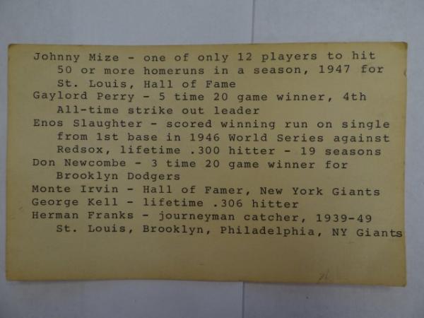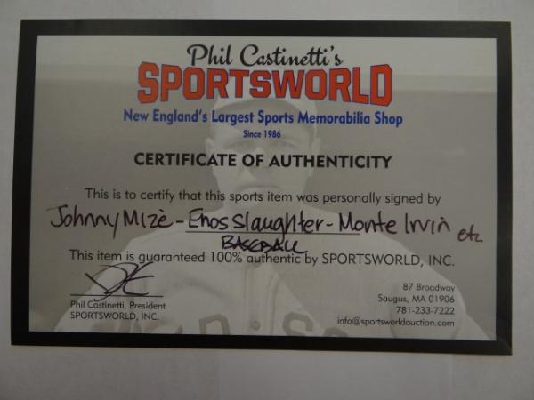 Johnny Mize, Enos Slaughter, Monte Irvin etc Signed Autographed MLB Baseball. Certificate of Authenticity Phil Castinetti's Sportsworld