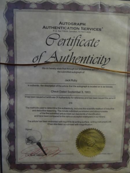 Item # 400 -- Framed Jack Ruby Photograph of Ruby Shooting Lee Harvey Oswald (7" x 9") along with a September 1963 Check Signed by Jack Ruby (3" x 8").