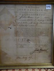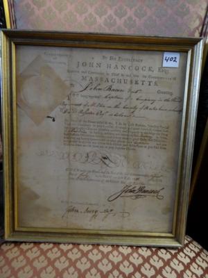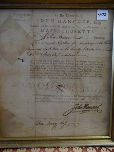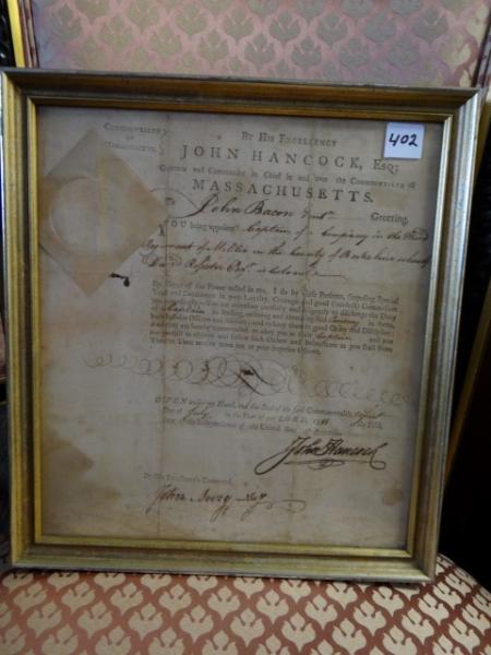 Item # 402 -- Framed Original John Hancock, July 1, 1781 Signed Commission Appointing John Bacon to Captain of a Company in the Third Regiment of Militia in the County of Berkshire, MA. Also Signed by John Avery as Secretary of the State of Massachusetts. Large Bold Hancock Signature. Folds, Wear and Staining. 12" x 10 3/4" Sight.