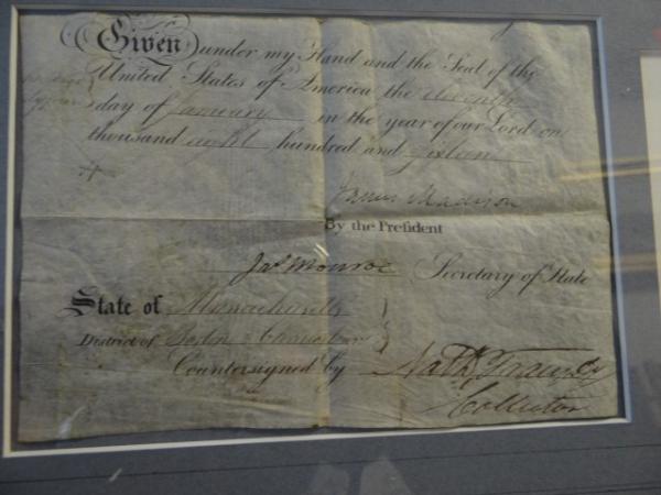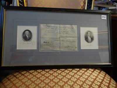Item # 404 -- Framed James Madison January 11, 1816 Original Signed Documents. Also Signed by James Monroe as Secretary of State of Massachusetts. 4th and 5th President Signatures. 5' x 7". Purchased at Goodspeed's Book Shop, Boston, MA