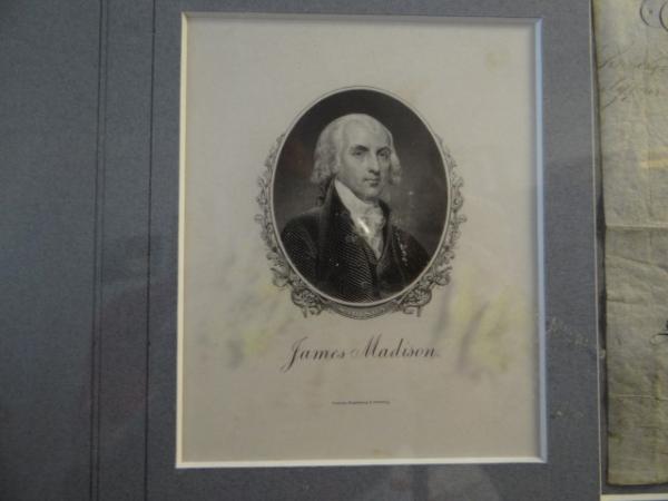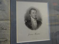 Framed James Madison January 11, 1816 Original Signed Documents. Also Signed by James Monroe as Secretary of State of Massachusetts. 4th and 5th President Signatures. 5' x 7". Purchased at Goodspeed's Book Shop, Boston, MA