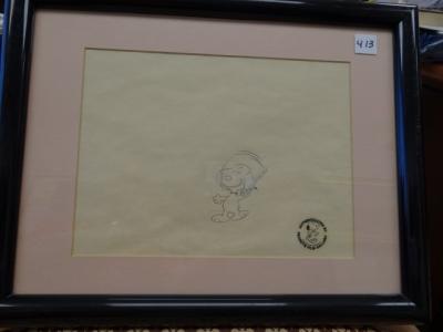 Item # 413 -- Peanuts Original Production Drawing "Snoopy". Peanuts Film Gallery Seal. 8 1/4" x 11 1/4" Sight.