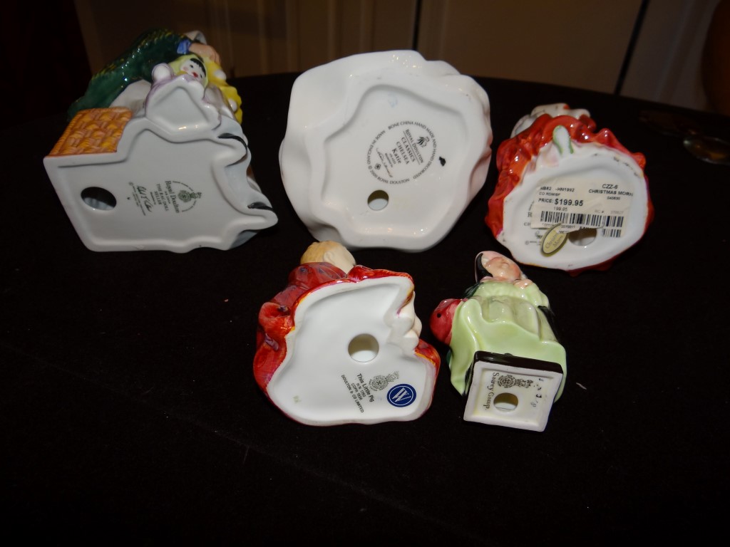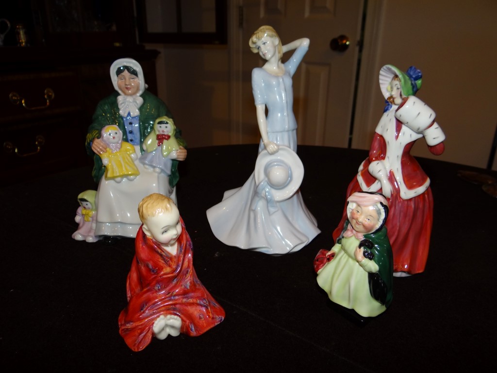Item # 32 -- (1) Lot of 5 Royal Doulton Figurines. Katie 8 1/2", Christmas Morn, The Rag Dog Seller, Sairey Gamp, This Little Pig.