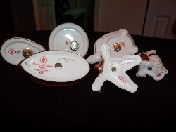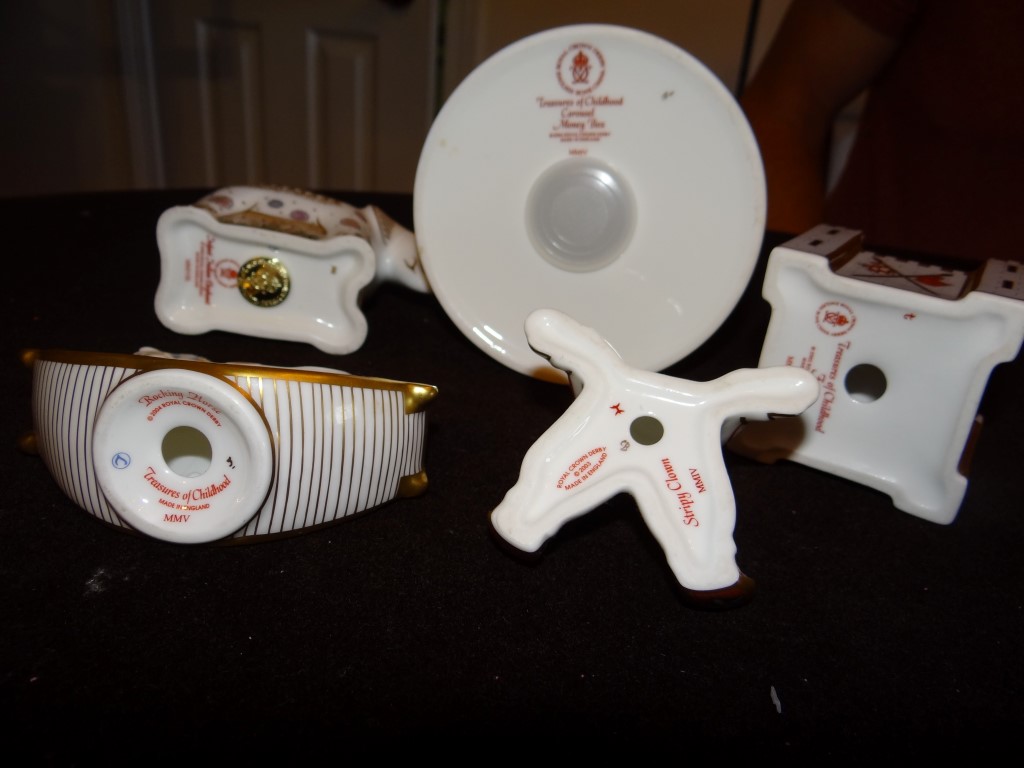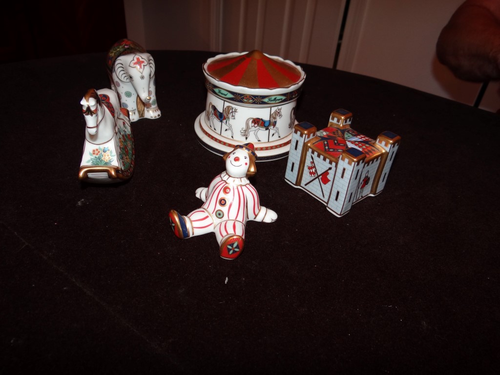 (1) Lot of 5 Royal Crown Derby Figurines. Rocking Horse 3 3/4", Infant Indian Elephant, Carousel Money Box, Fort, Stripy Clown