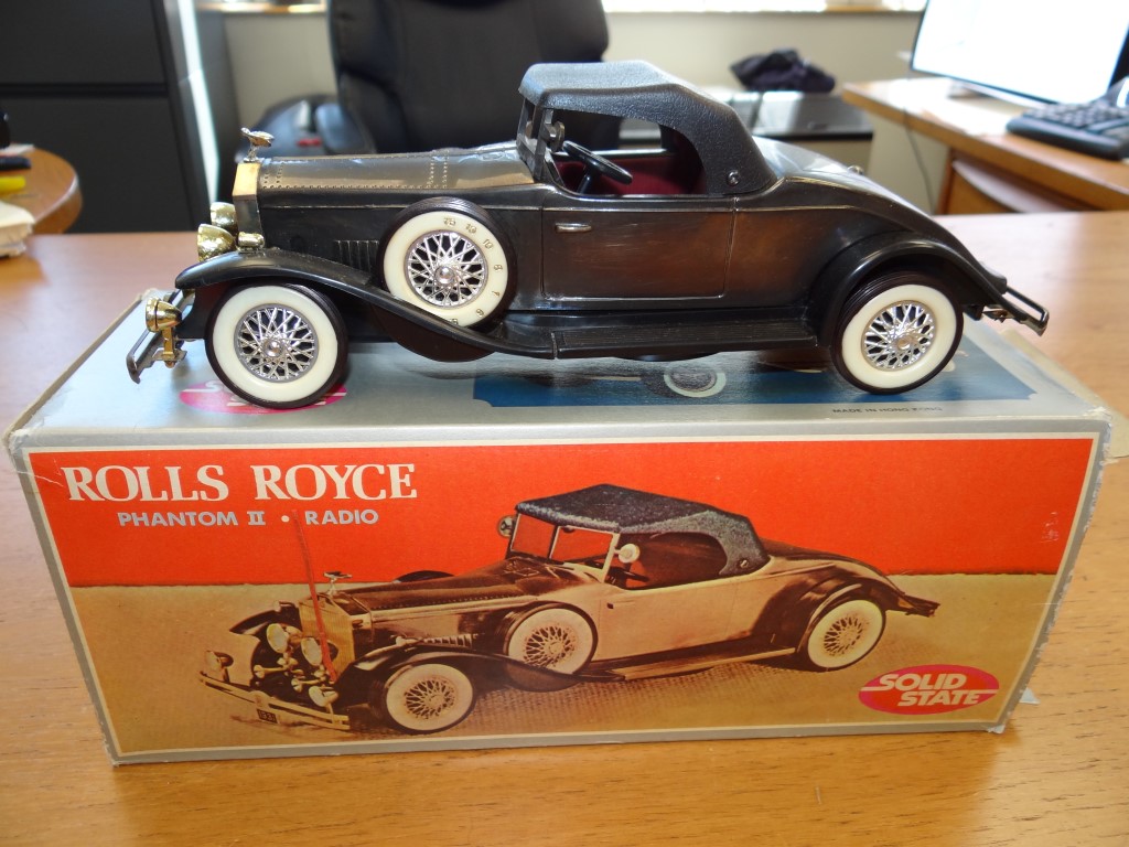 Item # 76 -- (1) VINTAGE ROLLS ROYCE PHANTOM II CAR SOLID STATE TRANSISTOR AM DESK RADIO, Along with (6) Rio 1/43 1905 Collectible Diecast Model Cars in Plastic Display Cases, 1938 Grande Mercedes 8 Cylinder CMC 7.700 R22, 1931 Rolls Royce Phantom II (Scoperta) R40, 1934 Duesenberg "SJ" Torpedo Phaeton (Scoperta) R46, 1932 Bugatti 5000 CC Modello "T 50" R48, 1932 Hispano Suiza R65 and 1931 Cadillac V 16 Cabriolet (Scoperta) R77.