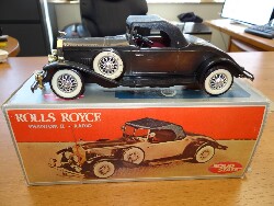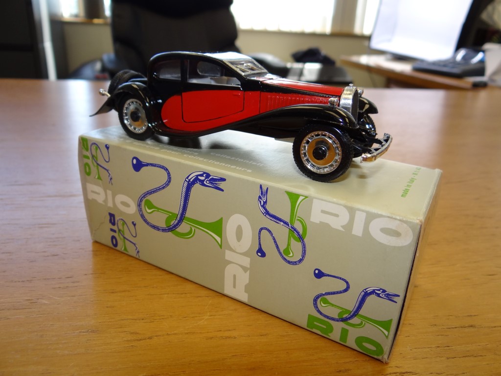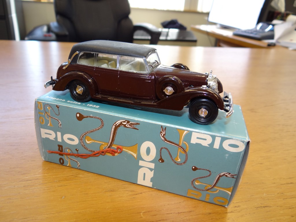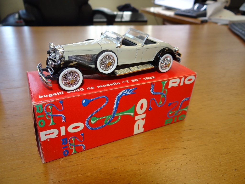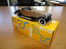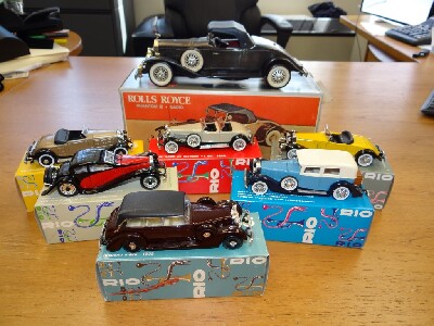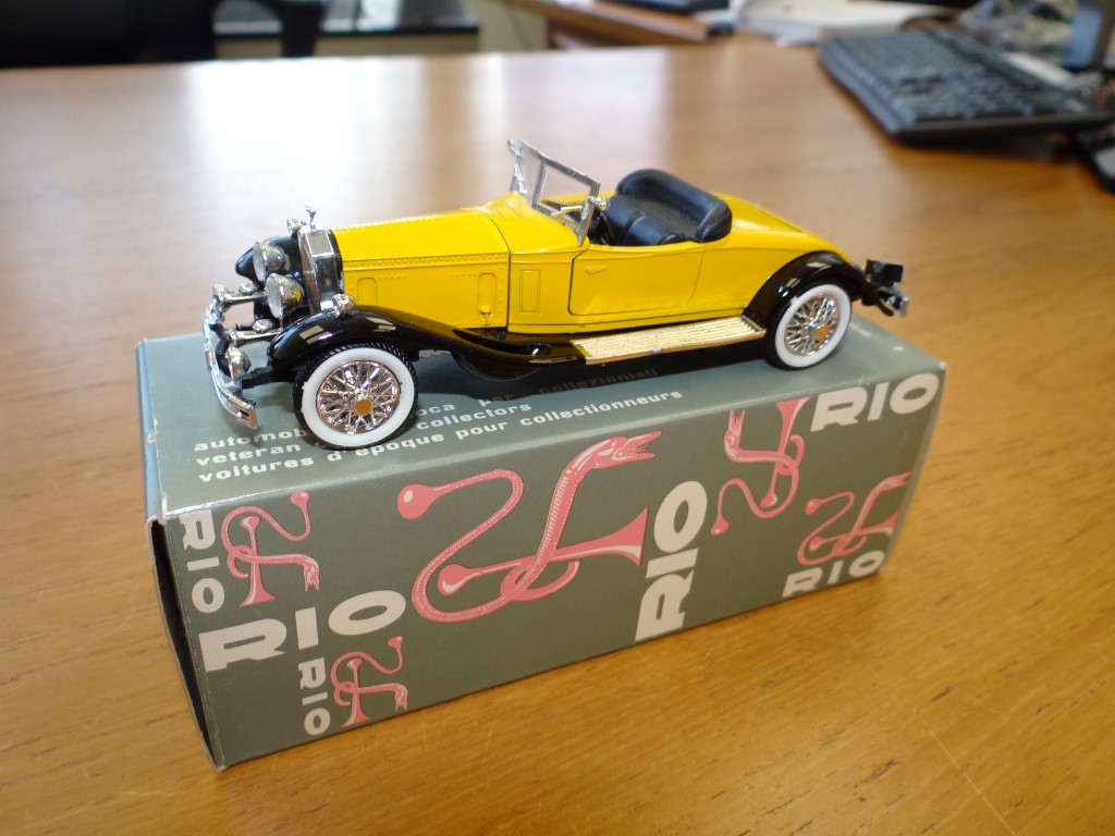 (1) VINTAGE ROLLS ROYCE PHANTOM II CAR SOLID STATE TRANSISTOR AM DESK RADIO, Along with (6) Rio 1/43 1905 Collectible Diecast Model Cars in Plastic Display Cases, 1938 Grande Mercedes 8 Cylinder CMC 7.700 R22, 1931 Rolls Royce Phantom II (Scoperta) R40, 1934 Duesenberg "SJ" Torpedo Phaeton (Scoperta) R46, 1932 Bugatti 5000 CC Modello "T 50" R48, 1932 Hispano Suiza R65 and 1931 Cadillac V 16 Cabriolet (Scoperta) R77.