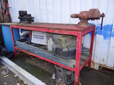 Item # 393 -- (1) Work Table 6' X 25" X 36" H. Along With Vanderman No. 8, 6" Vise. And Another 4 1/4" Vise.