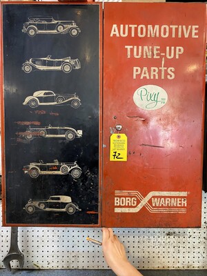 Item # 72 -- Borg Warner two door metal cabinet & contents of oil filters & clamps