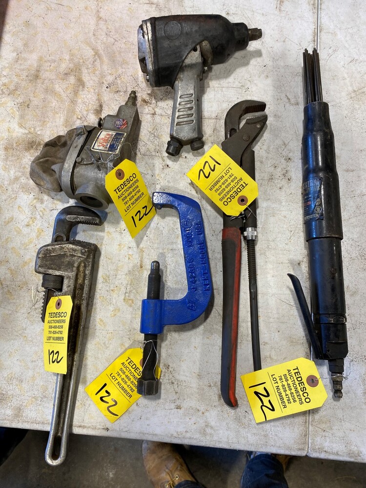 Item # 122 -- central pneumatic scaler, spark plug cleaner, snap on air impact wrench, Kent-moore clamp, ridgid wrench pipe