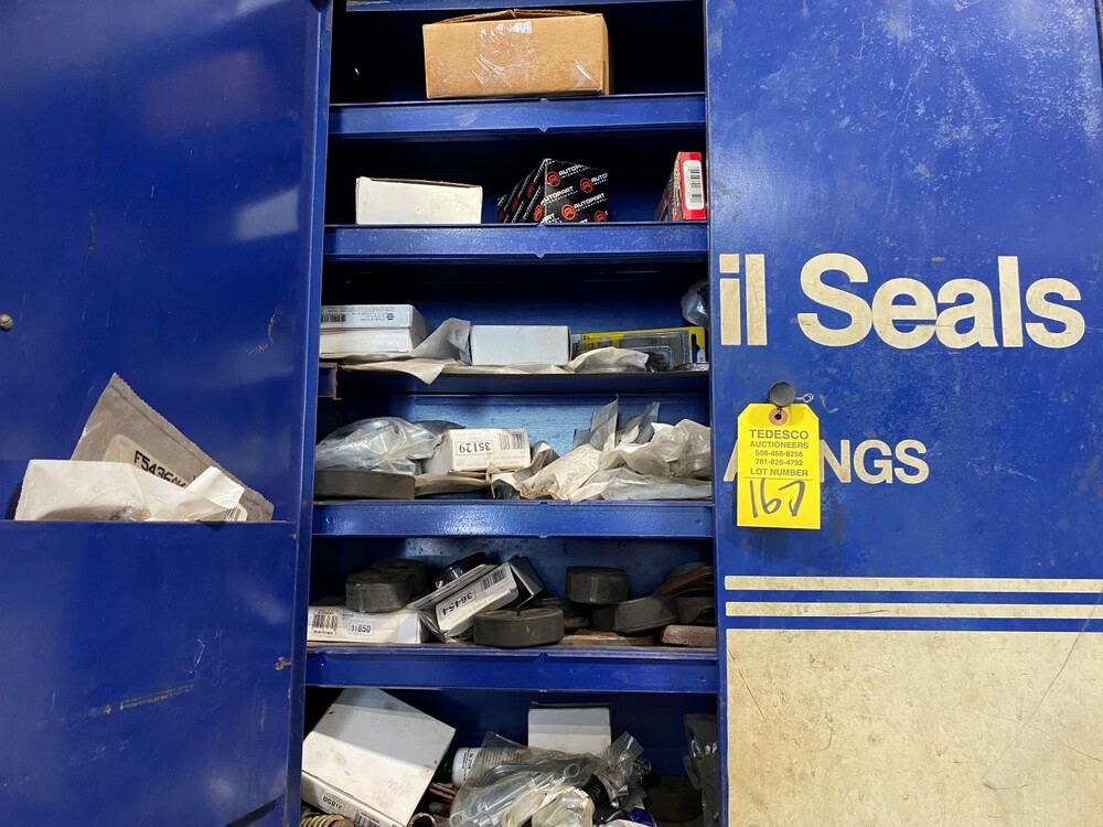 Item # 167 -- blue & white napa oil seals two door metal cabinet & exhaust gaskets