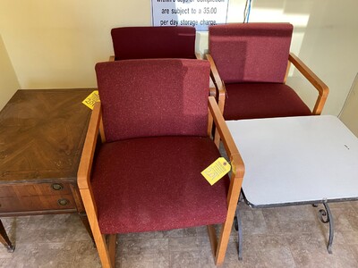 Item # 201 -- three matching maroon fabric arm chairs, two tables