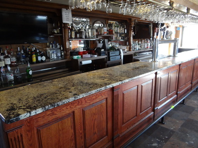 Item # 5 -- (1) Oak bar w/ onyx top - L-shaped 23' X 5'L X 2'D. Including Back Cabinetry.
