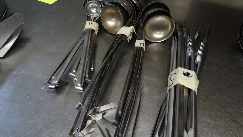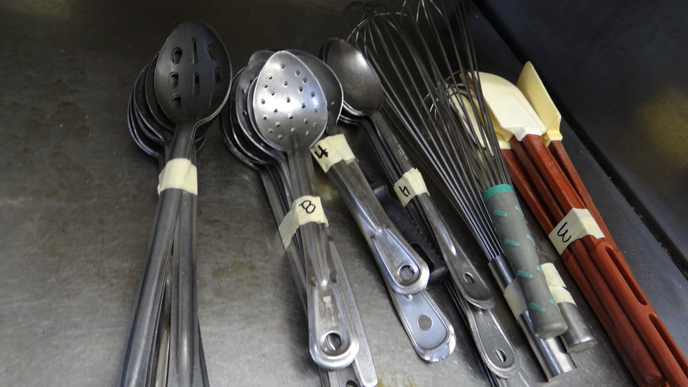 (1) Lot 4 Spatulas, 3 Wisks, 23 Serving spoons, 4 Ice cream scoops, 5 Tongs, 23 Ladles