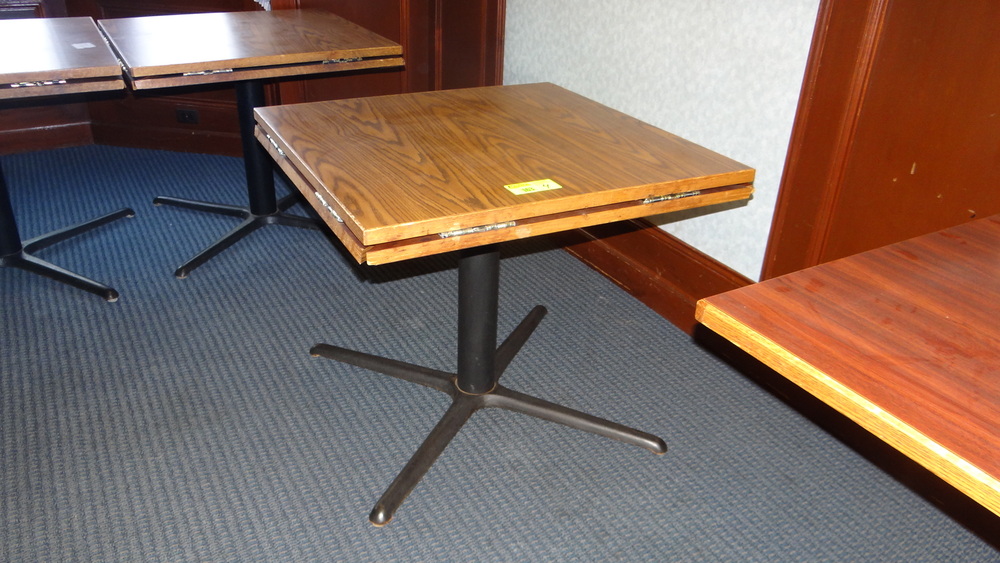 Item # 165 -- (4) Solid wood restaurant table with base. 34" X 34" with expandable flaps. 48" round