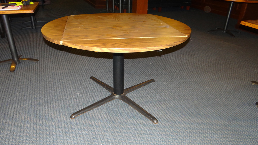 (4) Solid wood restaurant table with base. 34" X 34" with expandable flaps. 48" round
