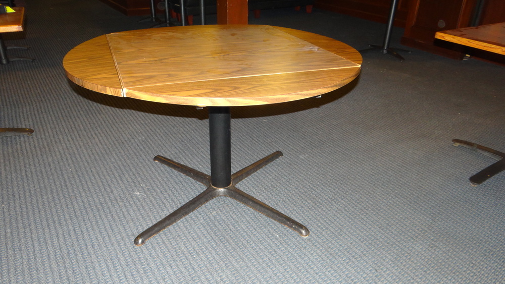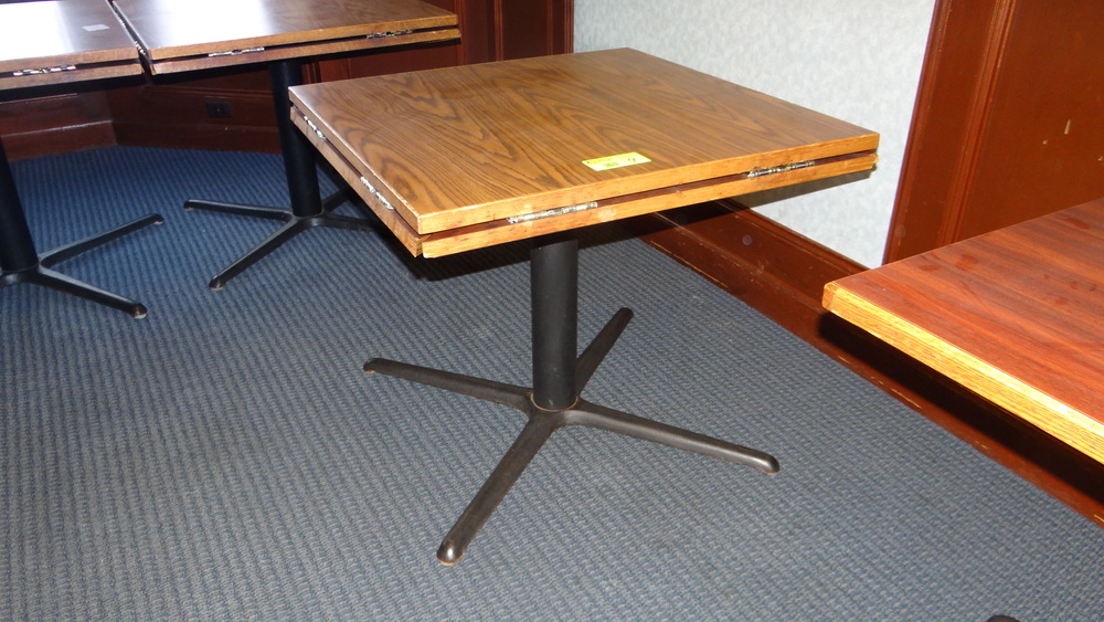 Item # 166 -- (4) Solid wood restaurant table with base. 34" X 34" with expandable flaps. 48" round