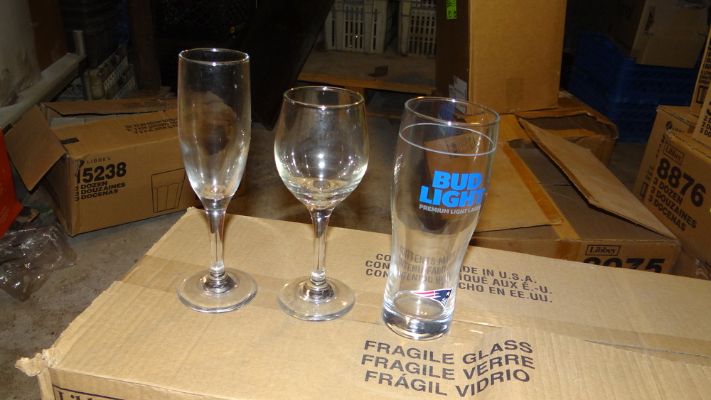 Item # 200 -- (65): (32) Libbey 3795 6 oz flute, (16) Bud 16 oz tumblers, (17) Libbey 3065 8 oz white wine. New in box