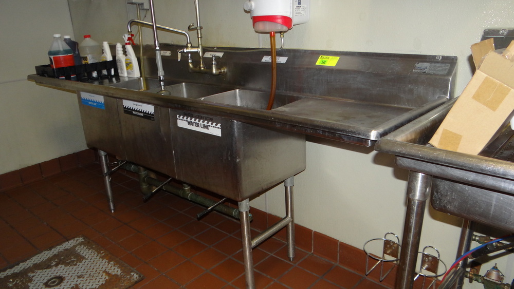 Item # 331 -- (1) Advance Tabco 3 Bay Deep Sink with Left and Right Drain Boards and Hand Spray 102" X 23" X 42" H and ECOLAB Sanitizer and ECOLAB Detergent Dispenser