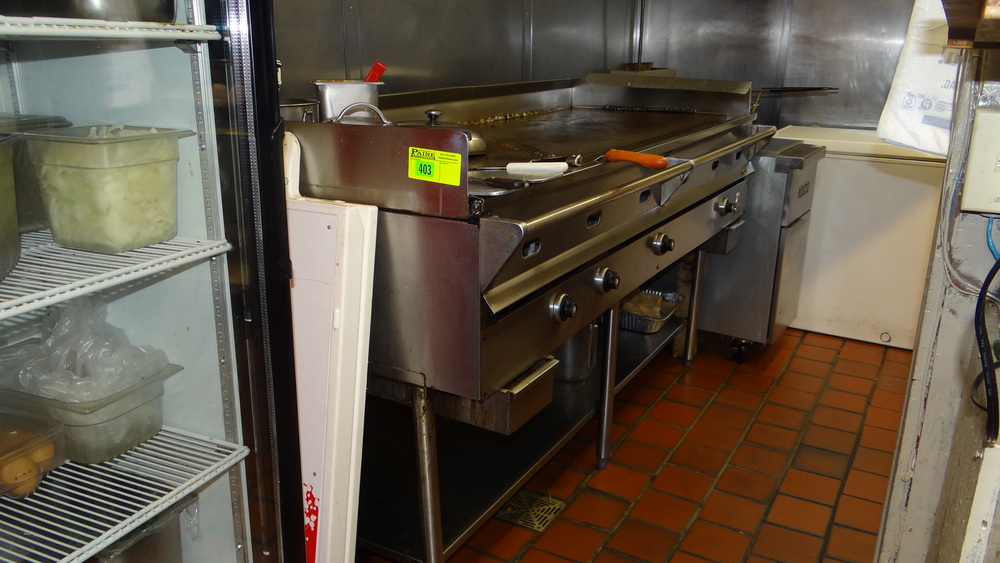 Item # 403 -- (1) S/S Wolf 4 Burner Flat Top Gas Grill. 6'x34"x18" H On S/S One Shelf Grill Stand. 26"x27"x26" H