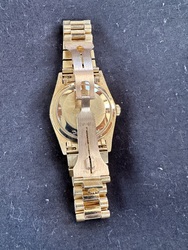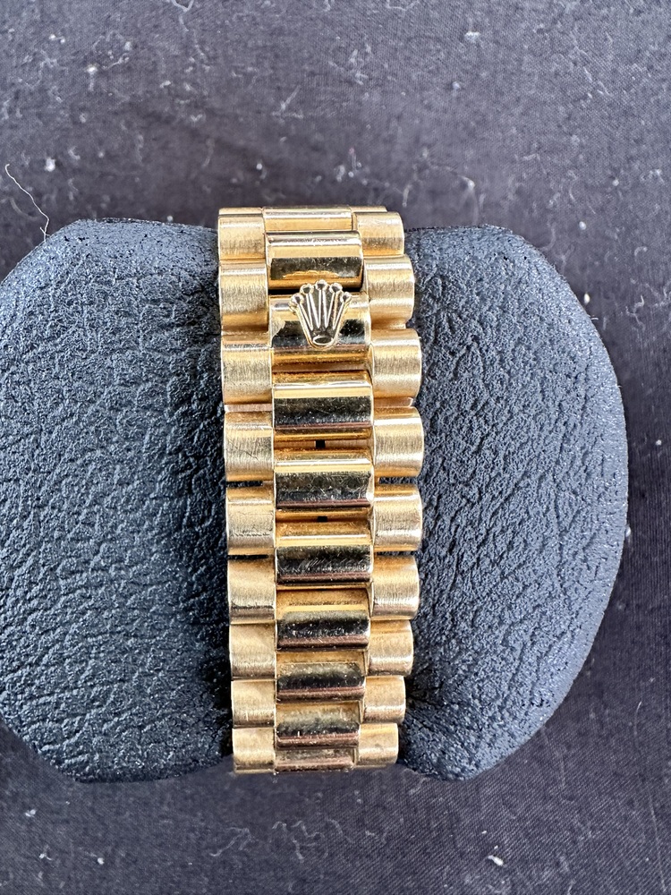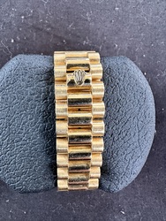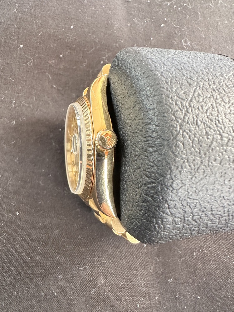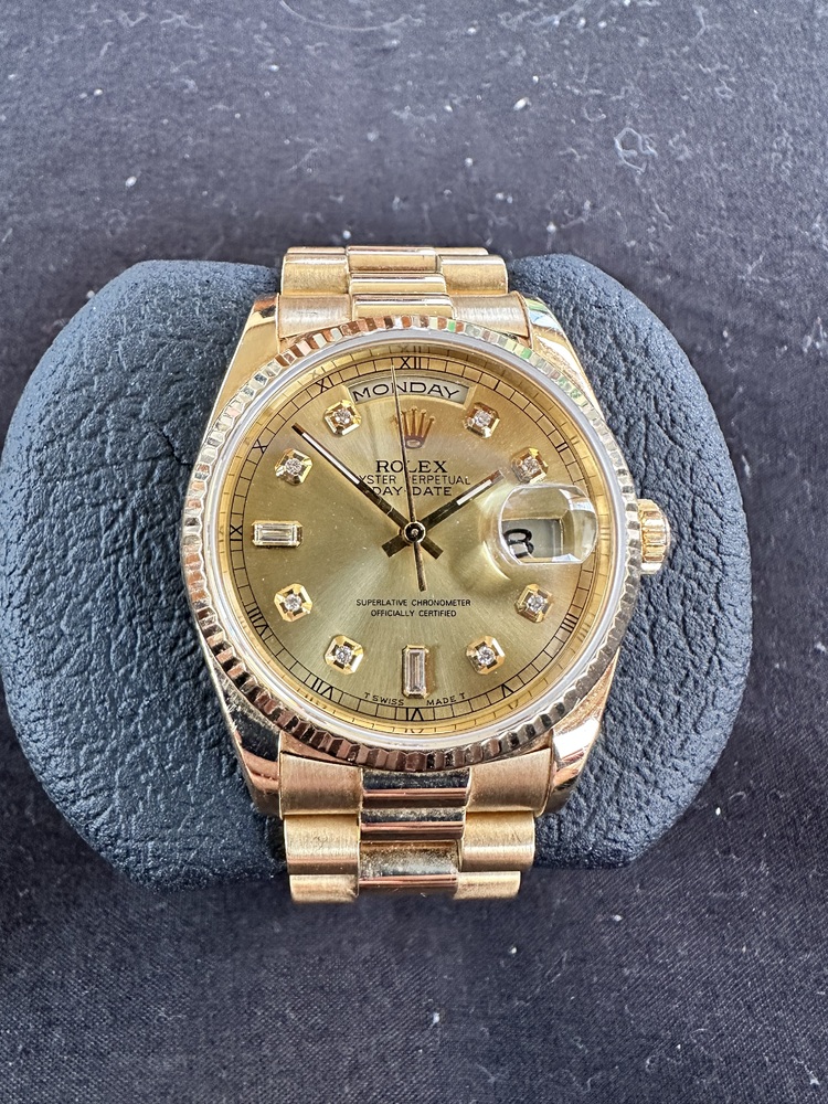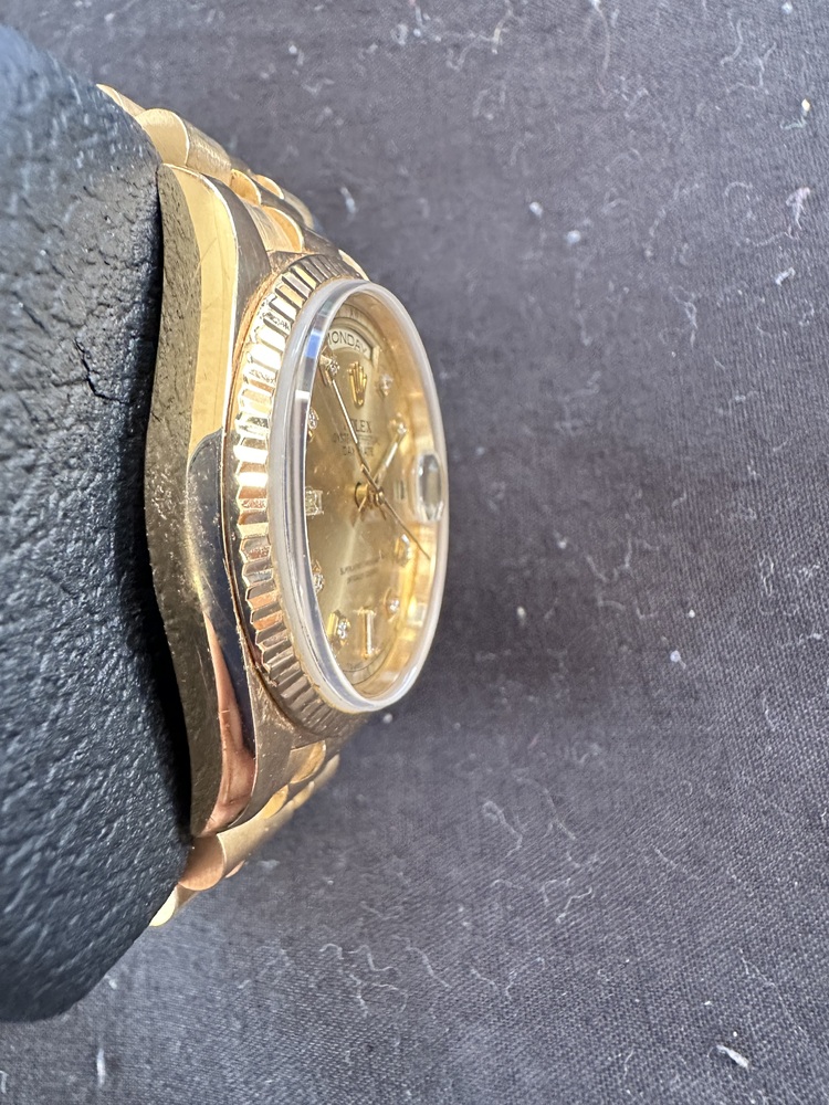 18K Yellow Gold Rolex 36mm Day-Date Wristwatch with a Double-Quick Movement and an 18K Yellow Gold Folding Deployment Clasp Bracelet and Genuine 18K Yellow Gold Fluted Bezel. The Watch Features an Aftermarket Champagne Color Diamond Dial as well as Aftermarket Crystal. Model: 18238. SN: W956941.