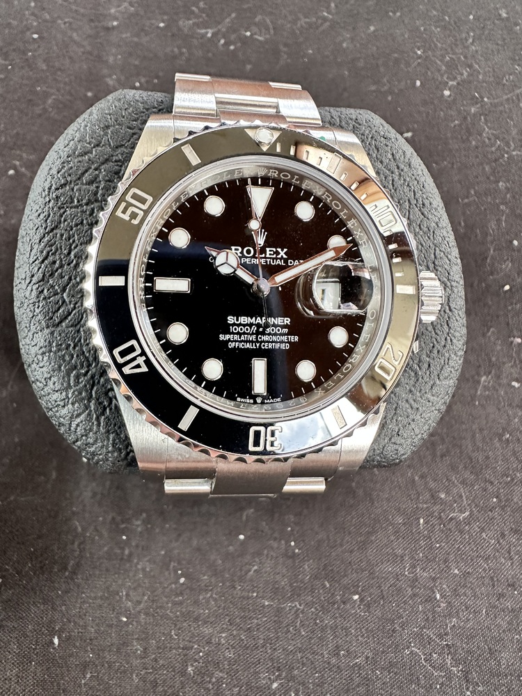 Stainless Steel 41mm Rolex Submariner Date Wristwatch. The Watch Features a Black Ceramic Bezel and a Black Dial with a Date Function. The Watch is Featured on an Oyster Style Folding Deployment Style Bracelet with Buckle. Model#: 126610. Seri a,#: 020927H1.