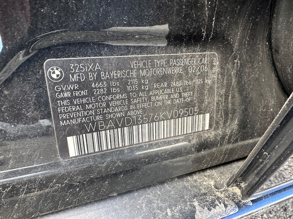 2006 BMW 325xi AWD (6 Cylinders 3.0L FI DOHC 183 CID). VIN: WBAVD13576KV09505. Odometer: TMU. No Keys. Framingham PD.