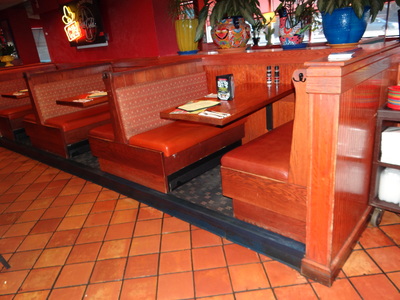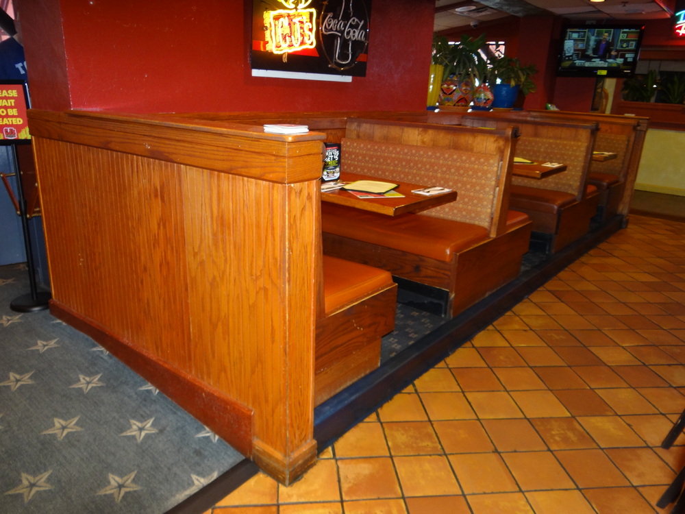 (1) Set of 3 Upholstered Booths w/ 3 Wall Mounted Oak Tables 24" X 48"