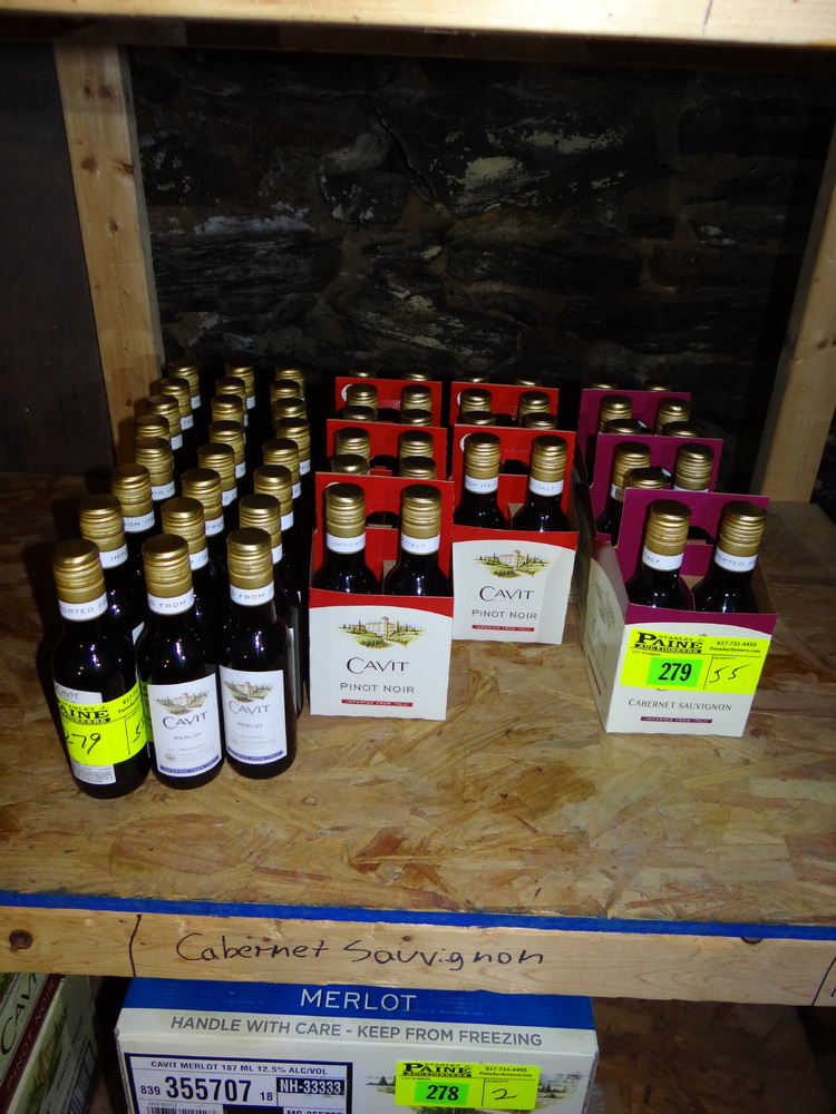 Item # 279 -- (55) 187 Ml Closed Wine Pourers Bottles, Cavit Asstd Wine, (24) Merlot, (20) Pinot Noir, (11) Cabernet Sauvignon. Bidders Must Have an Alcoholic Beverage License