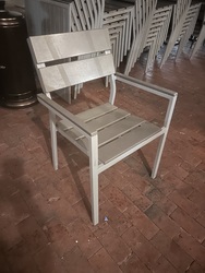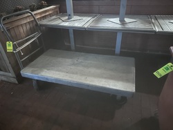 (2) Fully Upholstered Padded Seat and Back Banquettes 119" Each#227 - (4) Patio Metal Framed Gray Inlaid Center Umbrella Table. No Umbrellas 3' X 3'