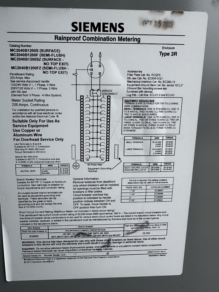 (1) Siemens MC 2040B1200S Meter Load Center Combination 100 Amp/200 Amp 20 Space, 40 Circuit Interior