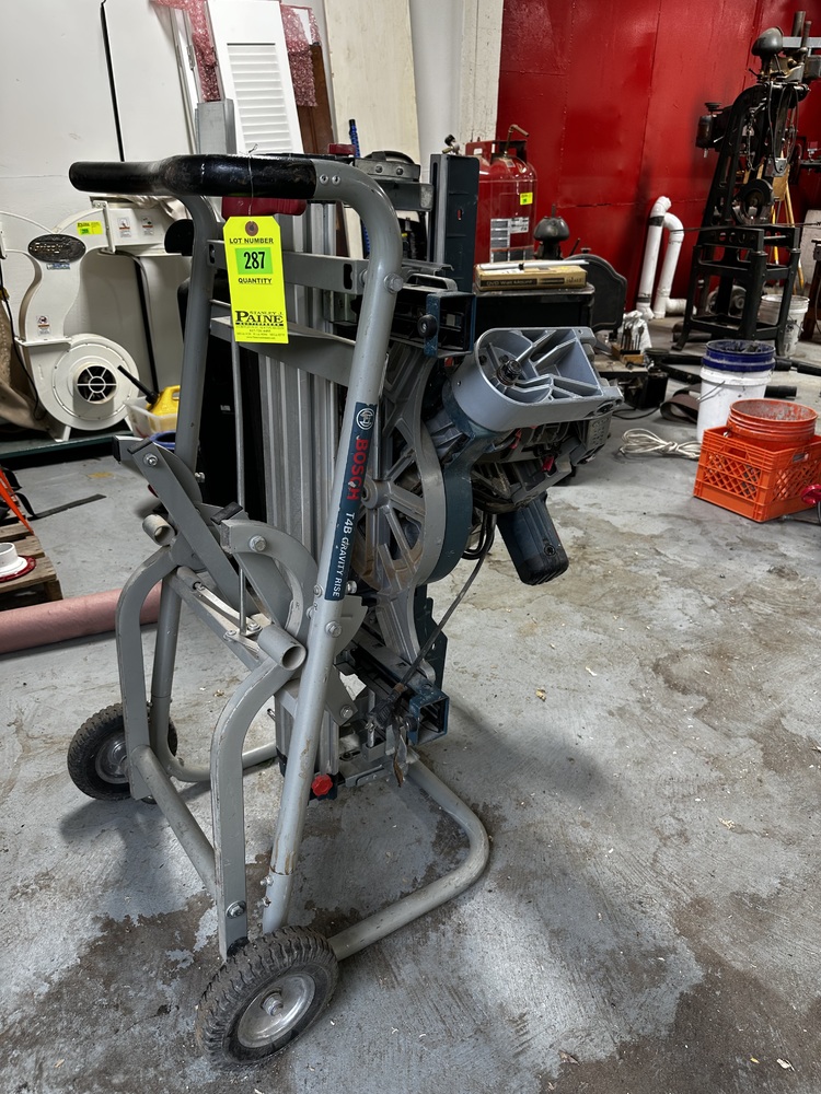 Item # 287 -- (1) Bosch GCM12SD Corded Dual Bevel Gear Miter Saw 12". Along with Bosch T4B Gravity Rise Wheeled Miter Saw Stand