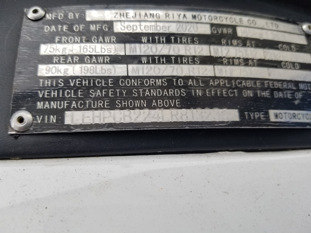 2020 ZHEJIANG RIYA AR-50 Scooter. VIN:LEHPCB224LR813236. Odometer: 633 Miles. Worcester, MA