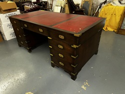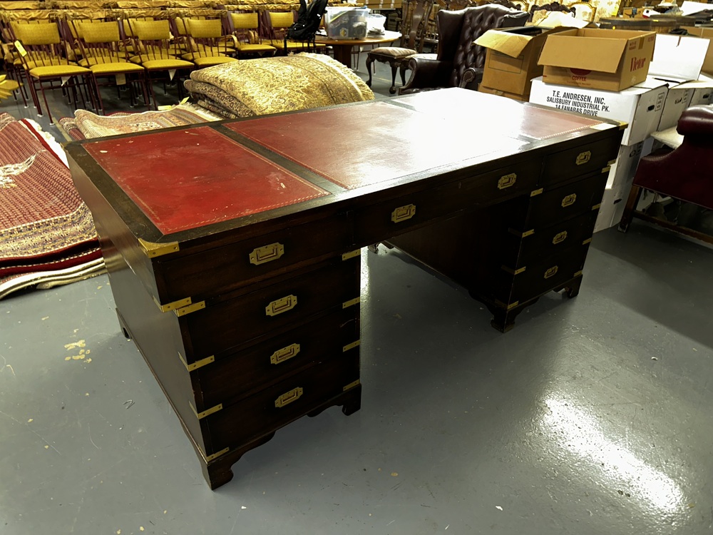 (1) Anglo Indian Brass Bound Executive Campaign Desk W/Red Morocan Tooled Leather Top And Inset Brass Handles And Band, 3 Part, 3' X 6'