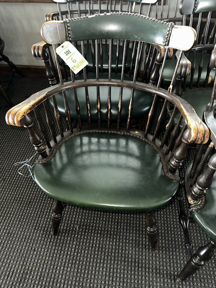 Item # 101 -- (6) Bowback Windsor Armchairs Upholstered Seats And Brass Tack Decoration