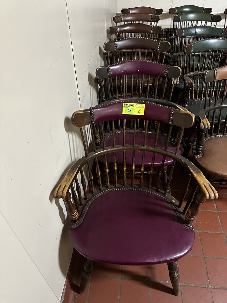 (6) BowBack Windsor Armchairs Upholstred Seats And Brass Tack Decoration.