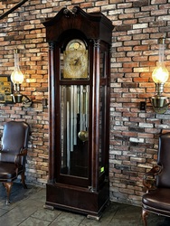 #302 - (1) Empire Revival 9 Tube Mahogany Clock w/Rocking Ship and Moon Dial, C.1910 100" H. Ratailed By Dauler Close & Johns Pitsburg PA. Westminster Chimes