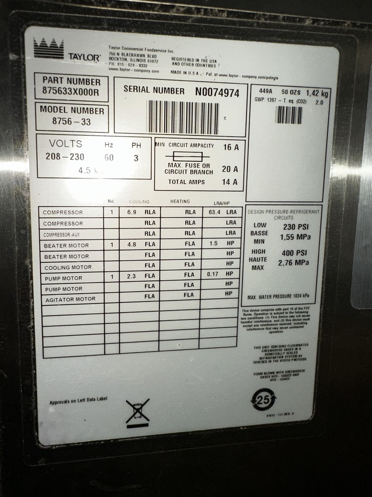 (1) 2020 Taylor 8756-33 S/S Soft Serve Ice Cream Machine. 208V 3PH 60HZ Water Cooled. S/C. 26" X 35"