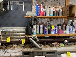 miniature lamps, grease gun, 20 used chemicals#107 - Blue Point blue roll cart, fluid evacuator plus