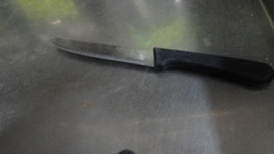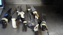 (1) Lot Asst'd knives, forks, pizza cutters, pastry servers and spatulas#130 - (3) Sets upholstered booths with solid wood tables 5' X 26"