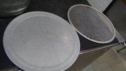 (1) Hobart dishwasher with sink and left and right drainboards 90" X 96"#87 - (24) Pizza Trays: 15 Pizza trays and 9 serrated pizza trays with stands