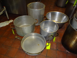 (4) Sauce Pans: (3) 4 1/2 Quart and (1) 3 1/2 Quart#266 - (5) Aluminum Stock Pots, Aluminum Stock Pot Steamer Basket, Braising Pan